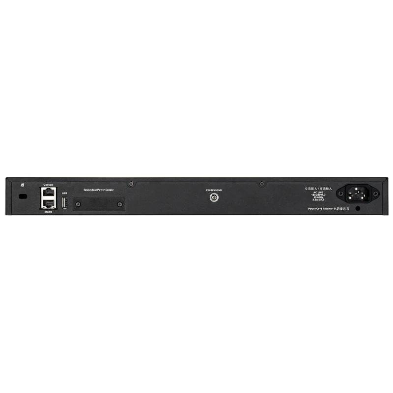 | Hardware | – Puertos: 48 x puertos 10/100/1000BASE-T PoE 2 x puertos 10GBASE-T 4 x puertos 10G SFP+ – Puerto 10/100/1000BASE-T RJ-45 para gestión CLI fuera de banda – Puerto 10/100/1000BASE-T RJ-45 para gestión de IP fuera de banda – Puertos de apilado (stacking): 4 – Coste de apilado: 2 – Puertos USB: 1 puerto USB 2.0 de tipo A Rendimiento – Capacidad de conmutación: 216 Gbps – Velocidad de envío de paquetes de 64 bytes: 161 Mpps – Memoria búfer de paquetes: 4 MB PoE – Estándares PoE: IEEE 802.3af IEEE 802.3at – PoE Power Budget: 370 W 740 W (con DPS-700 RPS) |