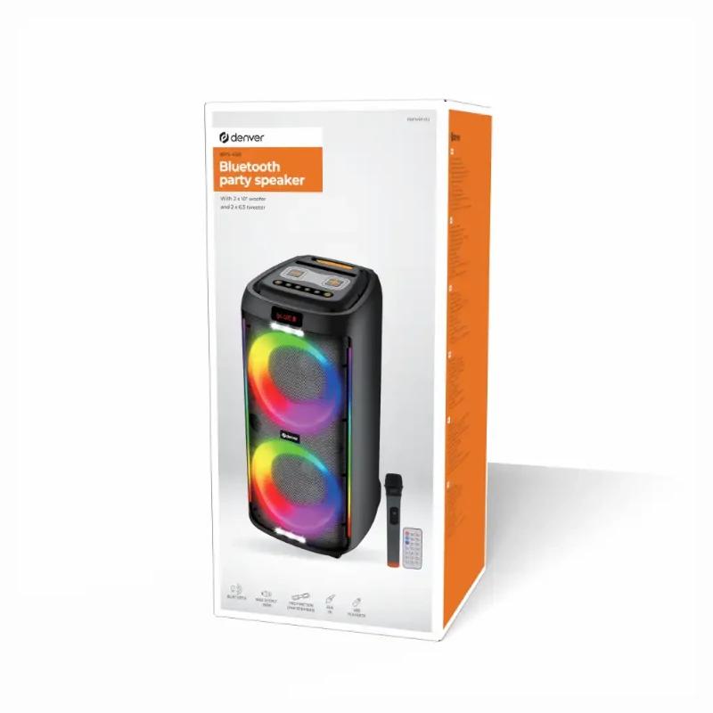 Con su diseño portátil y su luz LED circular alrededor de los woofers, el Denver BPS-458 es su altavoz ideal para cualquier ocasión festiva.