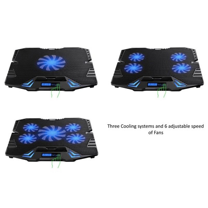 | Características | – Notebooks de 12" – 17" – Tipo de ventilador: 5 ventiladores silenciosos – Dimensión del ventilador: 125 x 125 x 10mm y 70 x 70 x 10mm – Color del ventilador: Azul – Velocidad del ventilador: 1000RPM a 2500RPM – Ruido: 25dBA – Flujo de aire: 80 CFM – Fuentes de alimentación: vía USB (5V DC) – Longitud del cable de alimentación USB: 50cm – Peso: 1.150gr – Dimensiones: 370 x 300 x 38mm – Color: Negro – Material: ABS y aleación de aluminio |