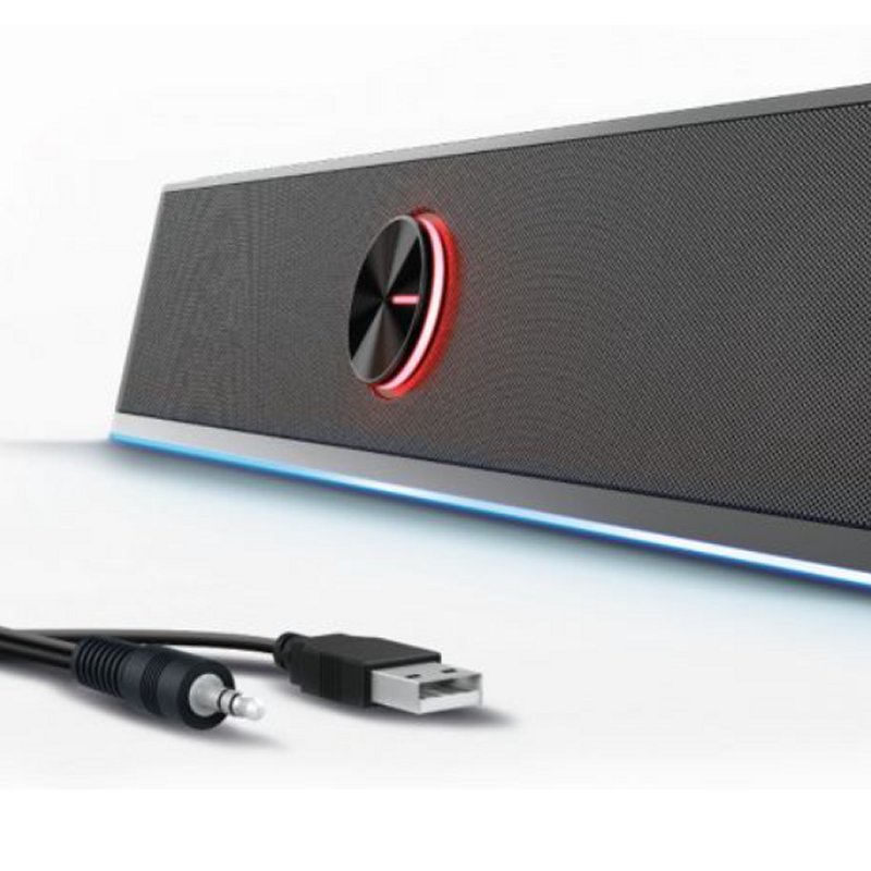 | Características | – Tamaño del altavoz: 2 pulgadas x 2 – Potencia de salida por canal (R.M.S): 2 x 3W – Respuesta de frecuencia: 150Hz-20 KHz – Sensibilidad: 750 mV ± 50 mV – SNR: ≥65dB – Impedancia nominal: 4 Ω x 2 – Voltaje de suministro: USB 5.0V / 1A – Interfaz de entrada: conector de audio de 3,5 mm y Bluetooth – Botones y controles en el dispositivo: Control de volumen – Material: carcasa de plástico + rejilla metálica – Tamaño de la unidad: 400 x 75 x 67 mm – Peso: 700 g – Color: negro |